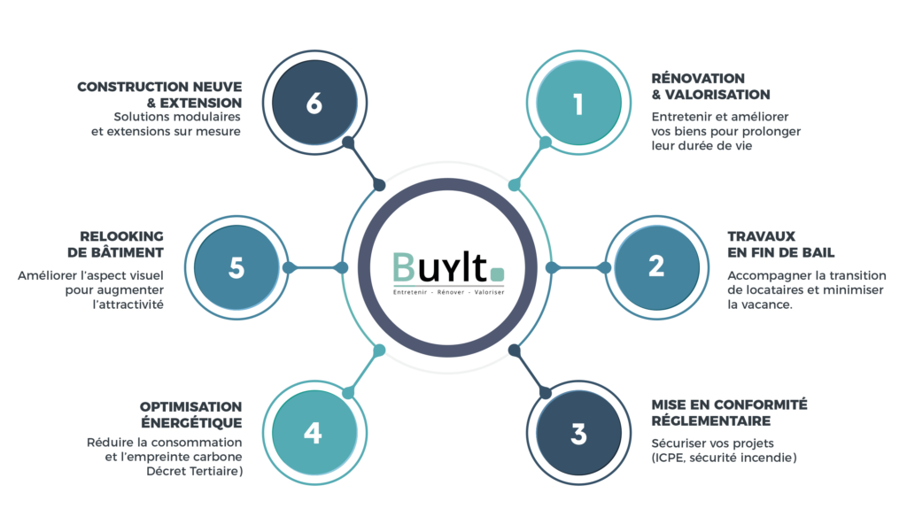 Buylt. est reconnu comme un acteur de référence dans le métier de la rénovation d’actifs professionnels. Notre force réside dans une expertise technique éprouvée et une connaissance pointue des enjeux de l’immobilier professionnel (logistique, activité, tertiaire et industrie).